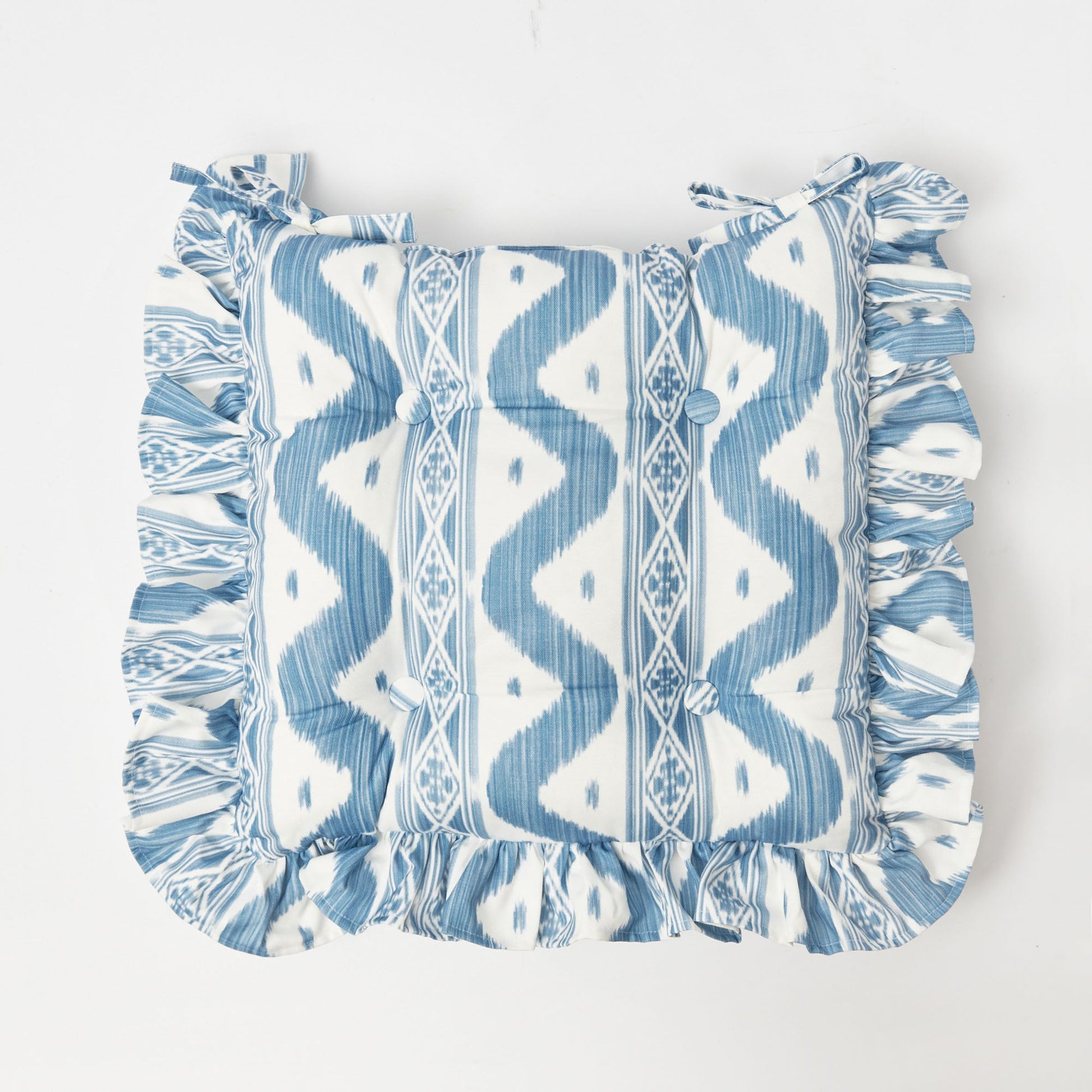 This pretty Frilled Blue Ikat Seat Pad Cushion Set is a delightful addition to your home.