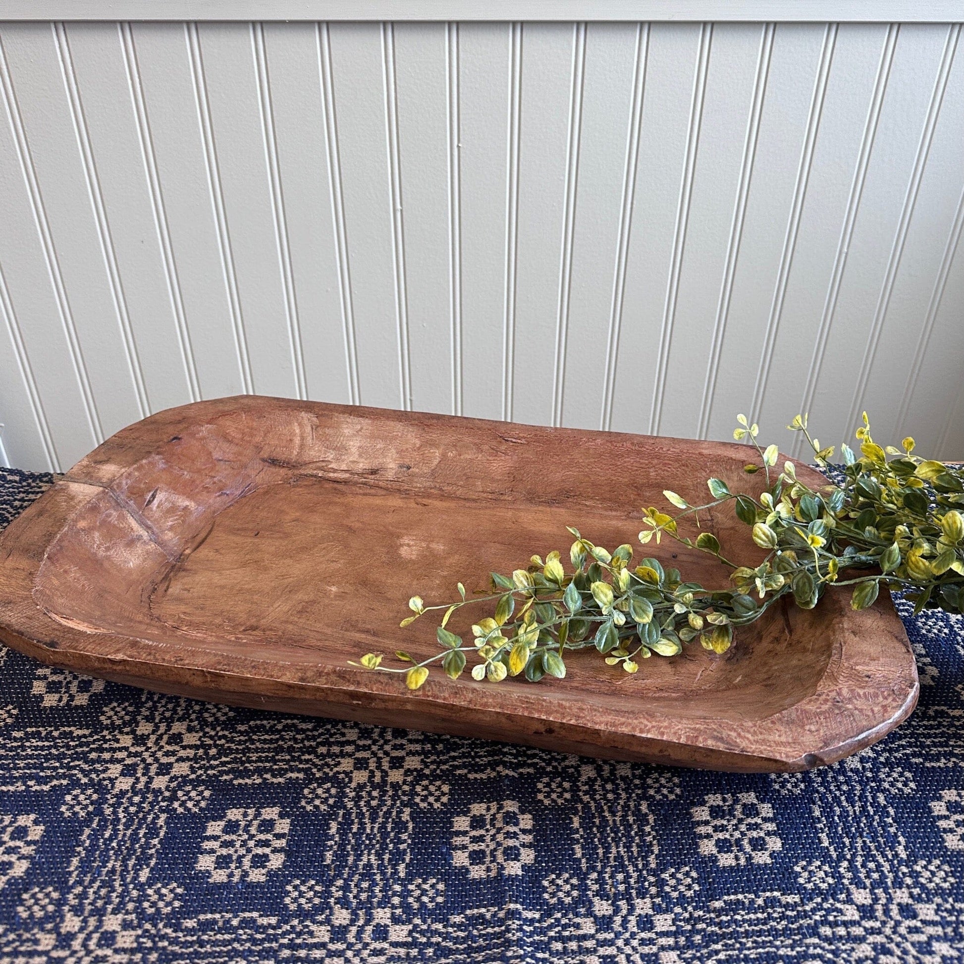Our beautiful wooden trays and bowls have so many different purposes! These can be used to display a charming pillar candle with some greenery around it or you could even use it to place some apples and oranges in for your family to enjoy! This Carved Wood Medium Tray measures approximately 20" long by 12" wide and is 2.25" high. Our tray is hand carved from rough-hewn wood and has a medium to dark stained finish. Please note that each tray is unique and no two are exactly alike. Place this on your kitchen island, dining room table, or dresser top for a rustic touch.