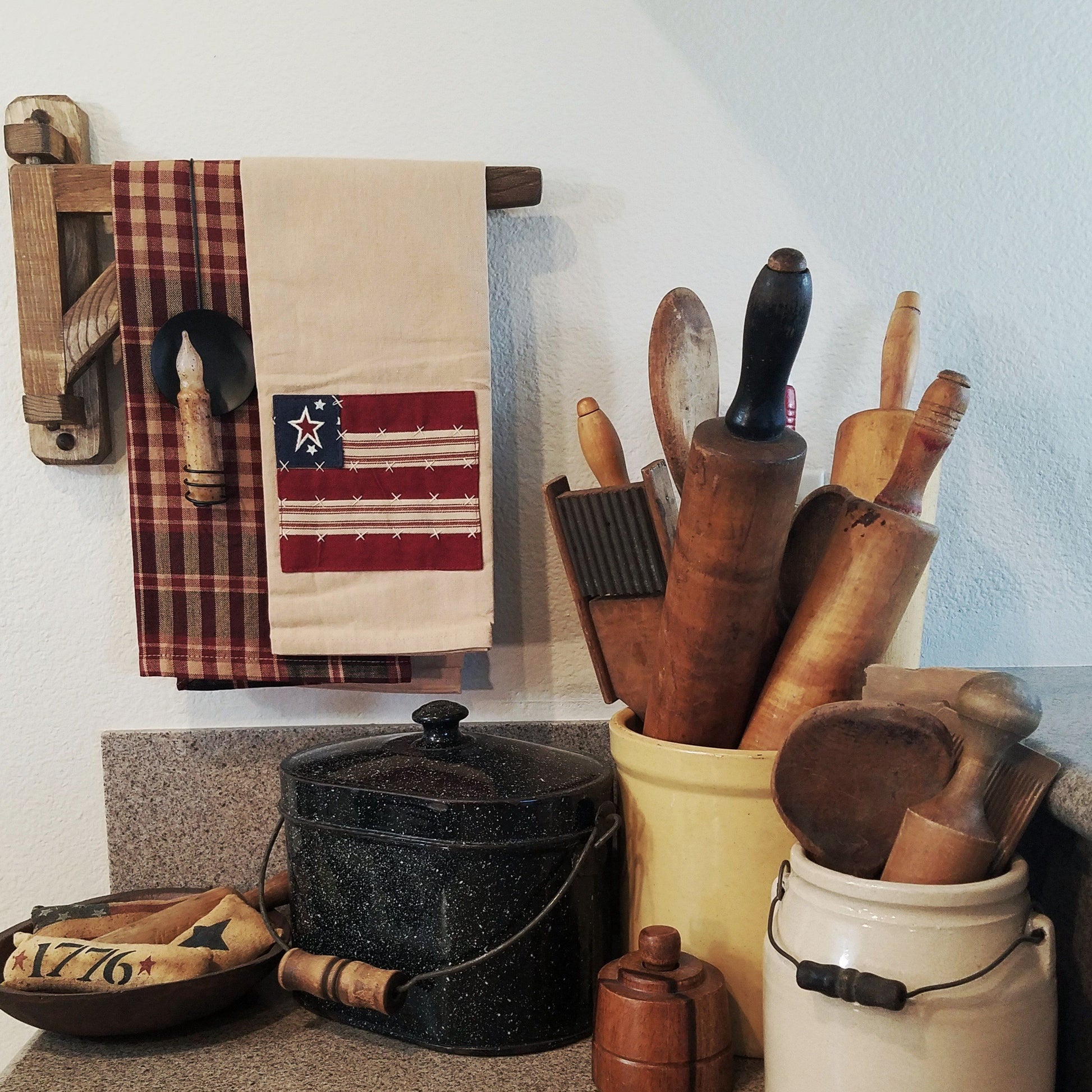 Display your farmhouse-inspired tea towels on our Handmade Black Wood Tea Towel Crane. This item is constructed from 100% wood and is handcrafted in California by Cetina Country Cottage. This beautiful wall accessory measures 14.75" long and 10" high and has a stained wood finish. Need tea towels to display on this rustic rack? Check out the full collection of tea towels we have to offer right here at Primitive Star Quilt Shop!