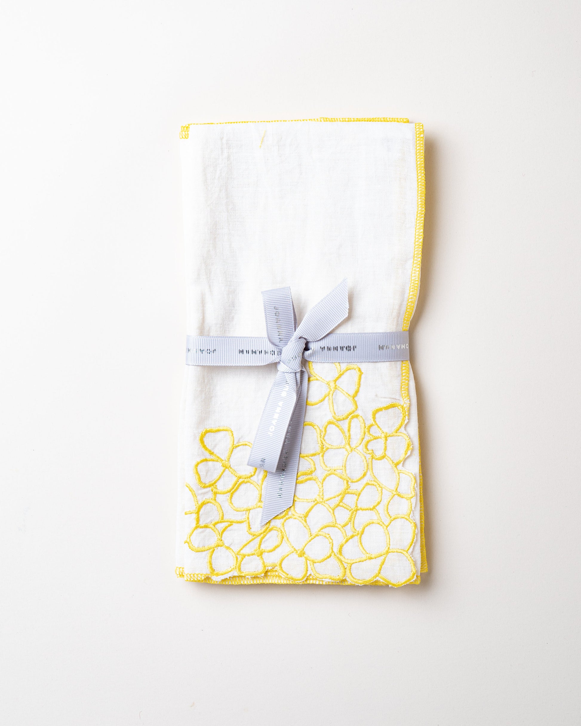 An exquisite pair of yellow dinner napkins by Joanna Buchanan. Inspired by the hydrangeas in her own garden they are then embroidered and hand-cut by our artisans in India. The perfect addition to a bridal lunch or garden party, or just a regular Tuesday night.