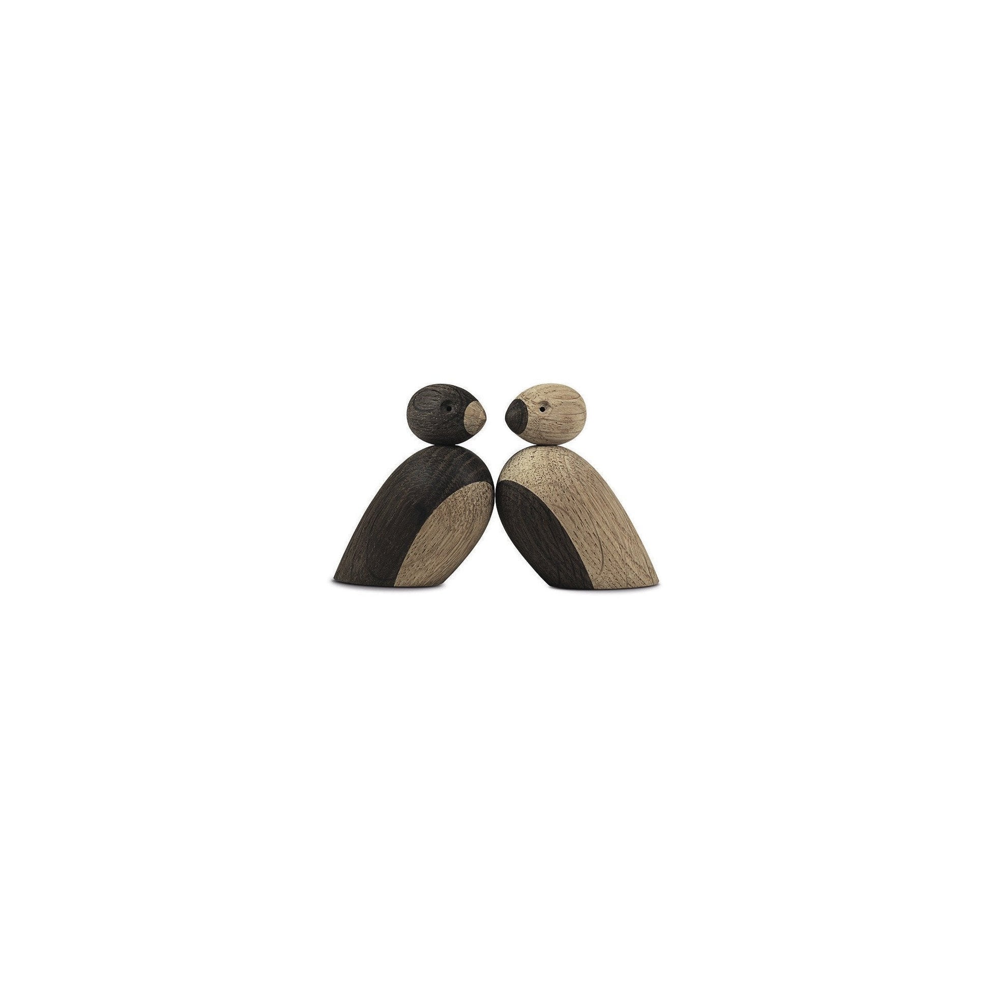 This pretty pair of sparrows was designed by Kay Bojesen and is made of natural oak and smoked oak. The two sparrows are 2.2" tall and have a magnet inside so they can be placed on a plank with other sparrows.