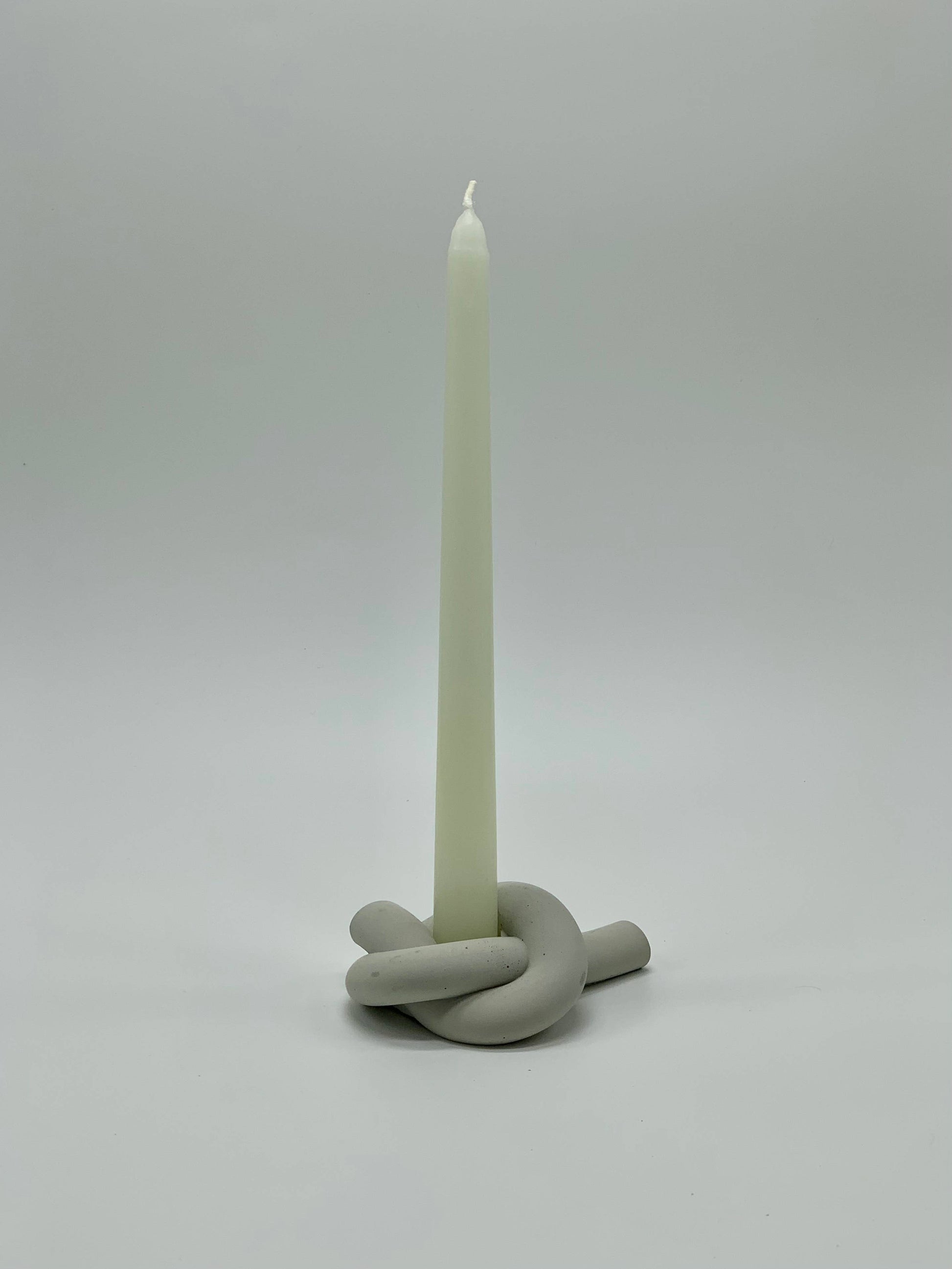 A handmade concrete knot shaped taper candle holder. Dimensions: Length: 4.3 inches Width: 3 inches Height: 1.5 inches Candle hole diameter: 0.9 inches Made in United States of America