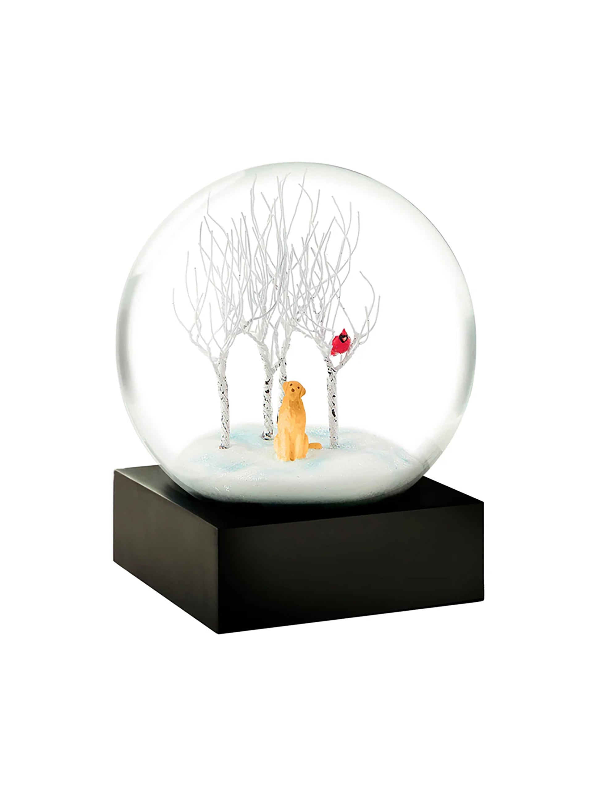 A winter snow globe with a sitting yellow lab beneath the branches of winter trees in which one of them has a perched red cardinal. When the globe is shaken, snow softly falls all around.