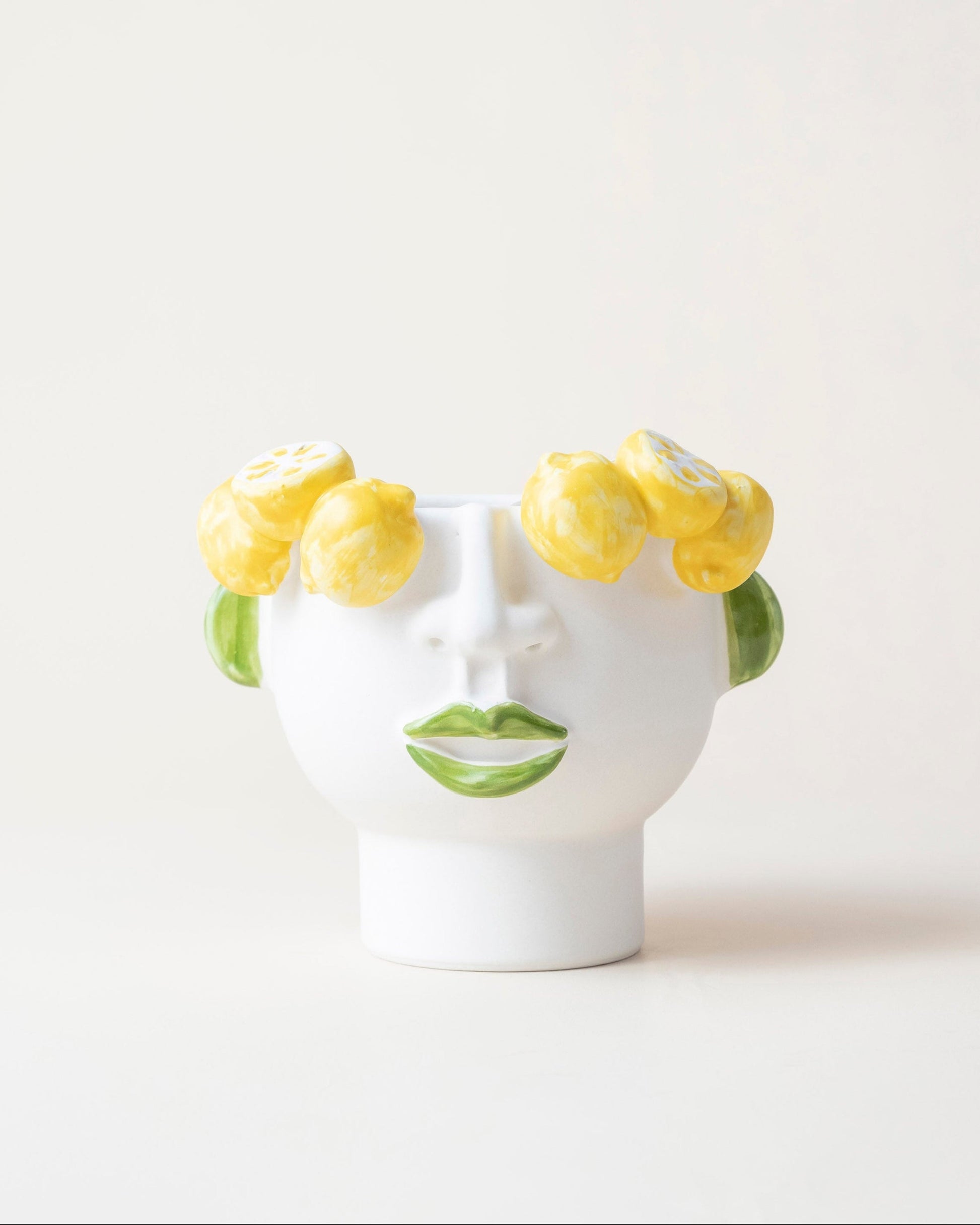 The beauty of Sicily is celebrated with this matte white plate from Patrizia Italiano, finished beautifully with a raised crown of lemon cutouts delicately hand-painted in yellow. The anthropomorphic inspiration is a tribute to the bubbly atmosphere of Sicilian open-air markets, here celebrated through Domitilla.