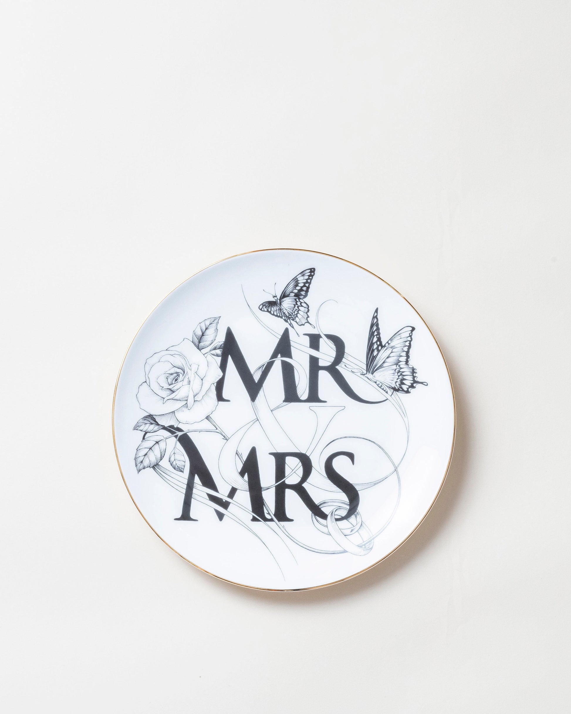 A fine bone china perfect plate by Rory Dobner. Hand decorated and hand edged in 22kt gold For the newly weds in your life, Rory Dobner's 'Mr & Mrs' fine bone china plate. In his signature style it features one of his intricate illustrations, here of a pair of butterflies, two rings, and a single rose, and is finished with a 22kt gold rim. To be used for long lunches and delicious dinners, but it's also beautiful enough to hang on the wall as a piece of art in it's own right.
