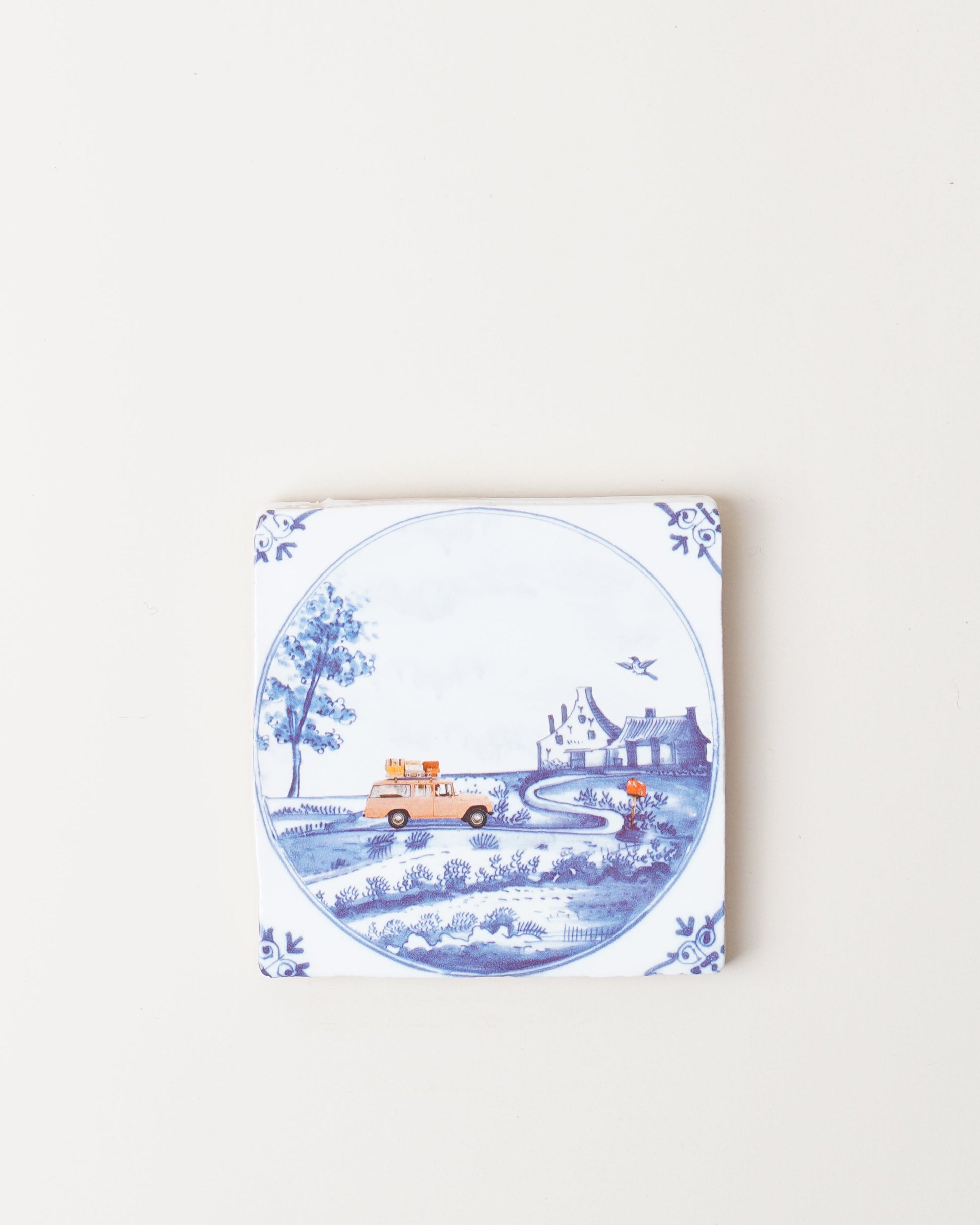 "A tile for the homebirds by StoryTiles. Ceramic tiles have been made in and around Delft, The Netherlands, since the 16th century. StoryTiles continues the tradition by creating miniature art-on-tiles. This one captures a packed car, arriving home after a trip, a holiday, or an adventure.