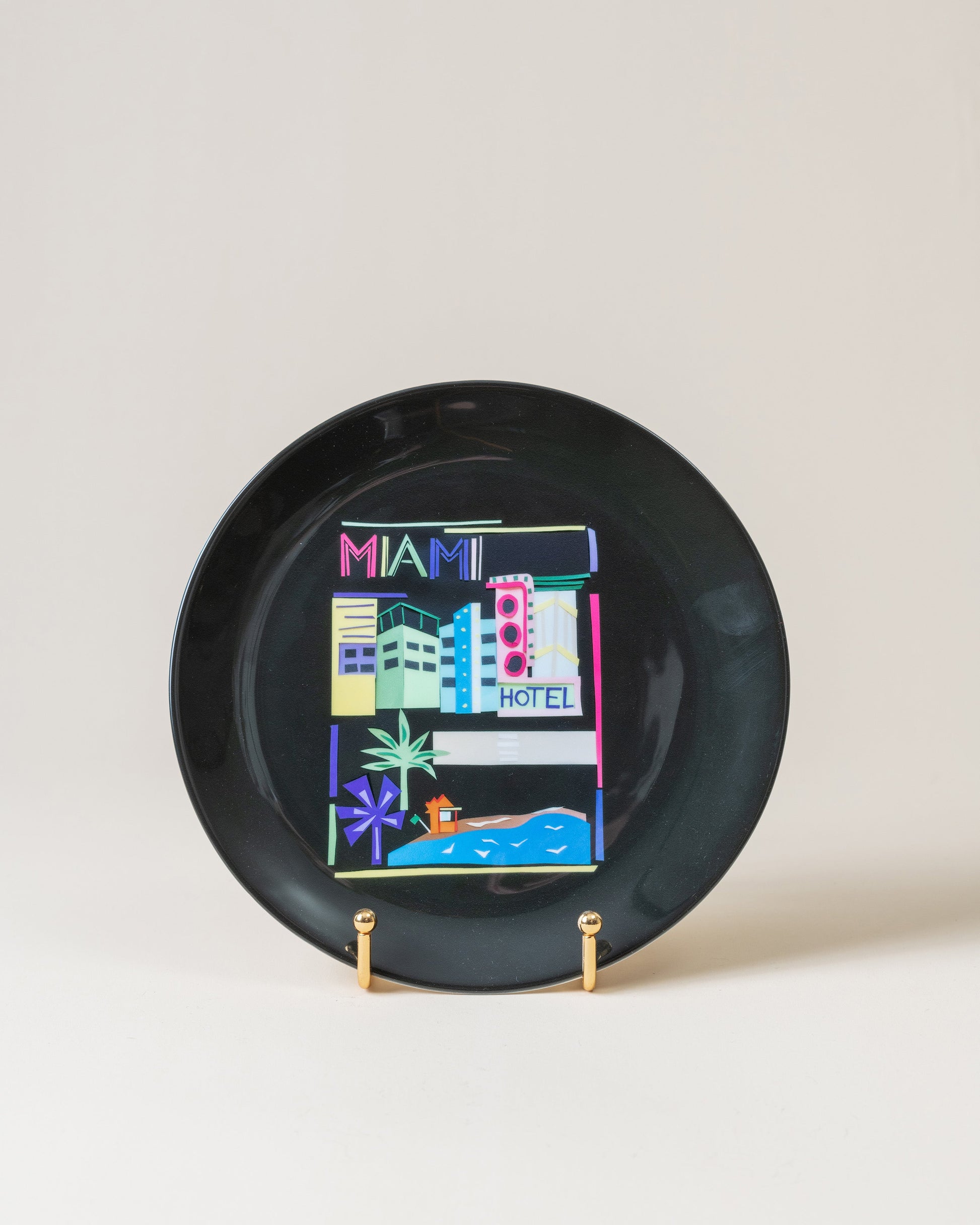 As bold as the place itself, this black Miami dessert plate from Tata Naka with it's building in bright block colours and sea in bright bright blue the only question left is, what's for dessert?